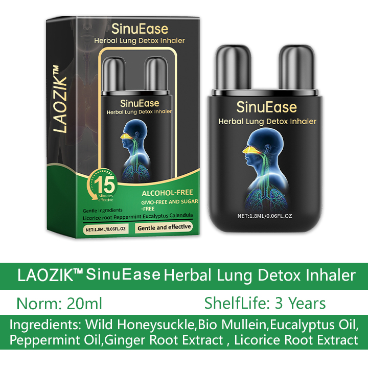 The LAOZIK™ SinuEase Herbal Lung Detox Inhaler uses particulate matter technology that combines the synergistic effects of various natural ingredients to liquefy and expel mucus in the lungs caused by smoking, air pollution, or environmental pollutants. This spray format ensures that the ingredients quickly penetrate deep into the airways, improve detoxification, and achieve a thorough lung cleansing, allowing for a swift return to fresh breath.